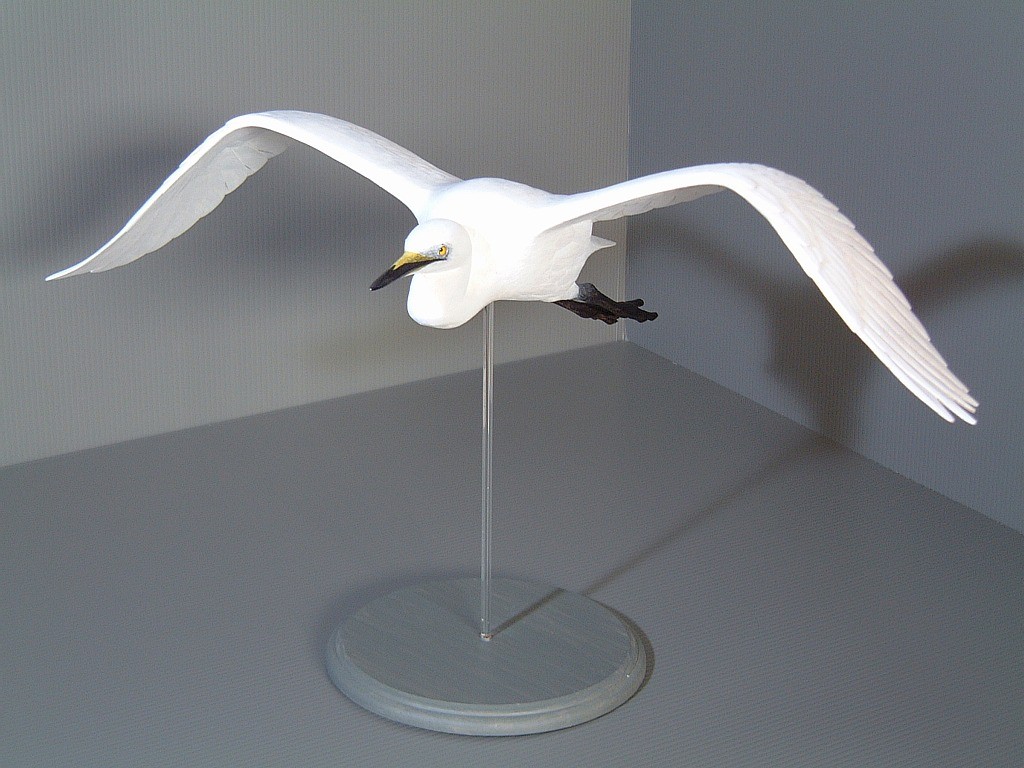 2つの関節(肩と手首)を使って 初列風切羽と次列風切羽の打ち下ろしと引き上げの位相がずれた羽ばたきをする。 初列風切羽の打ち下ろしの途中で 次列風切羽の引き上げが始まる。 次列風切羽を引き上げるとき、揚力を大きくするため迎角を大きくする。 それにより生じる負の推力は 初列風切羽の打ち下ろし(手首の曲げ)で生じる正の推力で打ち消される。 このようにして、羽ばたきの全行程で正の揚力と正の推力が保持できる。 首が長いので、飛行のときは首をS字型に曲げ、重心を後へずらす。 (2003年1月制作、1/2縮尺、1号)